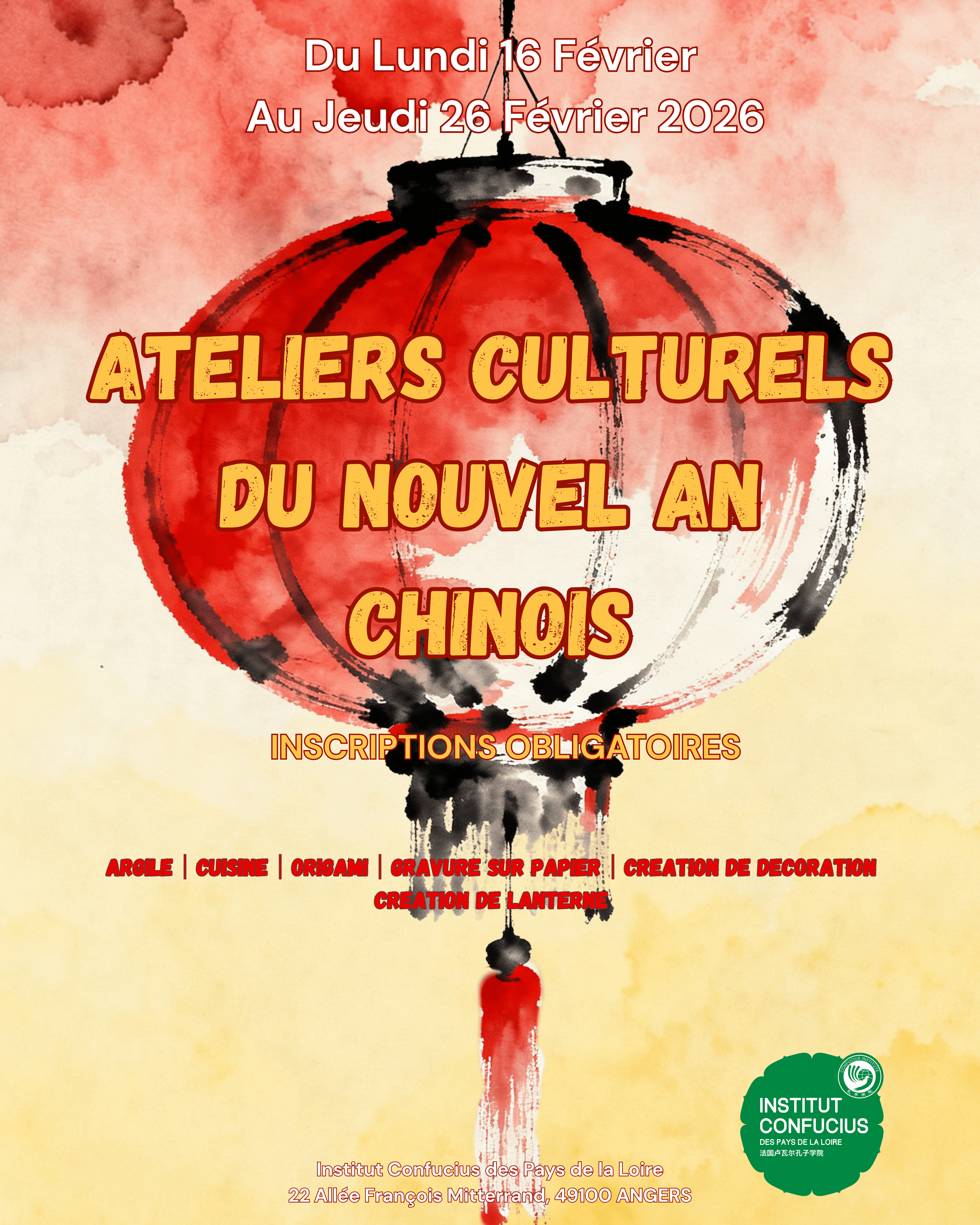 Adresse postale et lieu des ateliers : Institut Confucius des Pays de la Loire – 22 Allée François Mitterrand, 49100 ANGERS