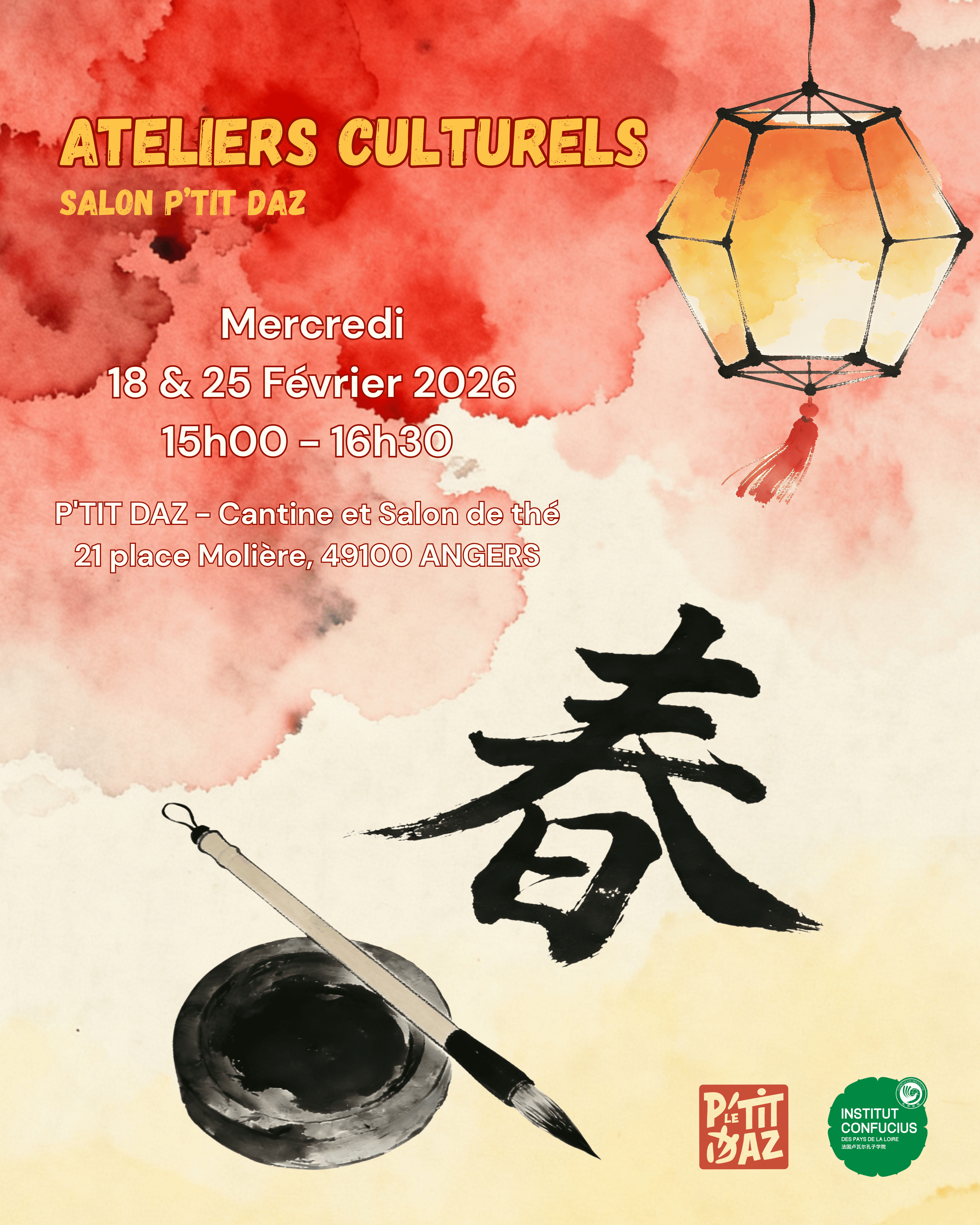 À l’occasion du Nouvel An, l’Institut Confucius des Pays de la Loire s’associe au P’tit Daz pour vous proposer des ateliers culturels de calligraphie. Ces activités vous permettront de découvrir les traditions chinoises dans une ambiance conviviale. Que vous soyez initiés ou débutants, venez partager un moment de créativité et de détente pour célébrer cette nouvelle année !